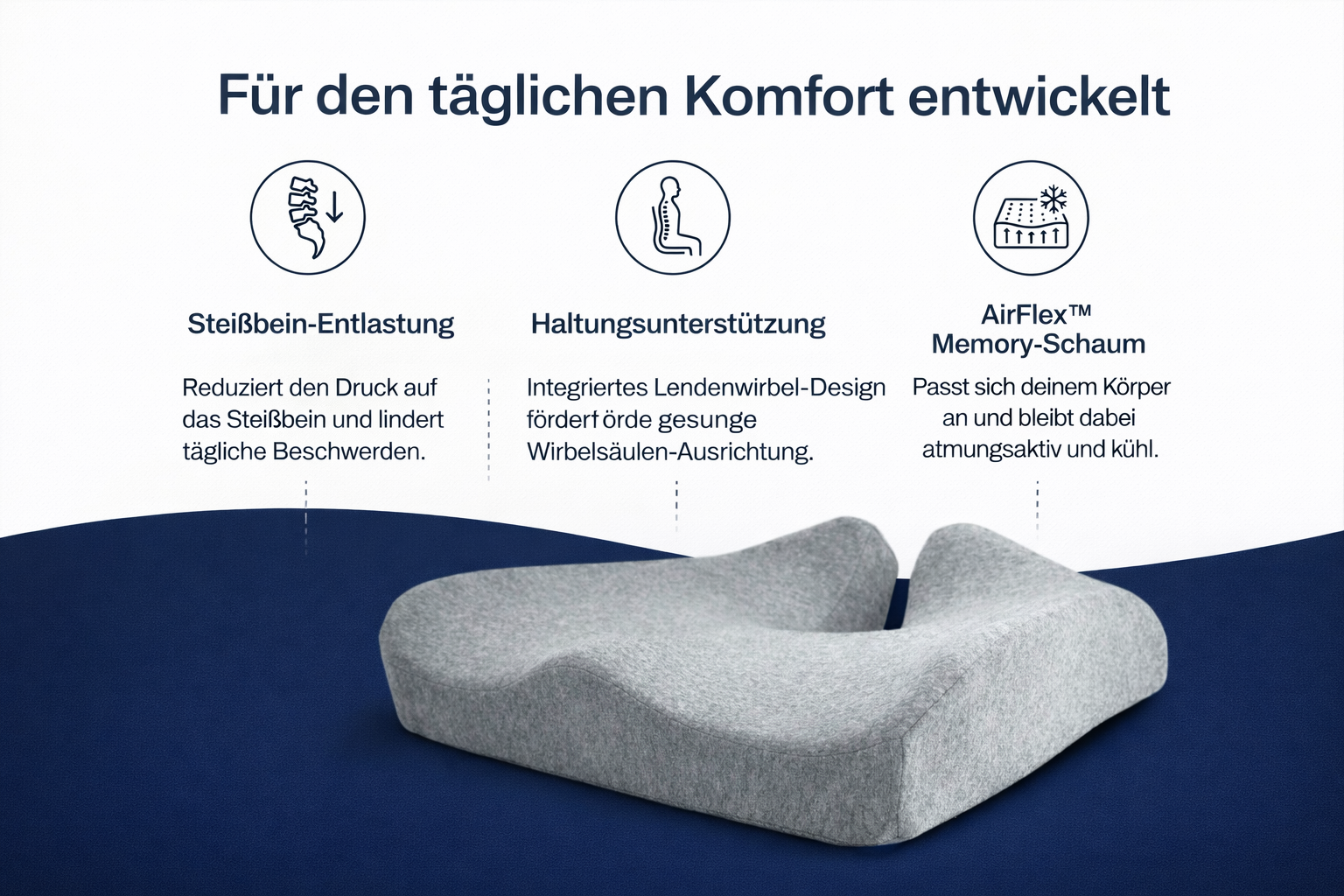 Ja. Das AUFRECHT-Sitzkissen wurde speziell entwickelt, um den Druck auf das Steißbein und den unteren Rücken gezielt zu entlasten. Durch die ergonomische Form und den druckentlastenden Memory-Schaum eignet es sich ideal für alle, die über längere Zeit sitzen – ob im Büro, im Auto oder zu Hause. Viele Nutzer berichten von spürbarer Entlastung bereits nach kurzer Zeit.